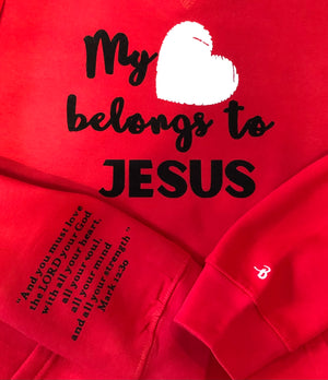 Show your love for Jesus with our exclusive Heart Belongs to Jesus sweatshirt. This warm and stylish red sweatshirt features the popular phrase, "Heart Belongs To Jesus." It features a fingerprint on the heart as well as a "Jesus" printed in bold script. This top is sure to be a hit! Be fly in your Christian shirt.